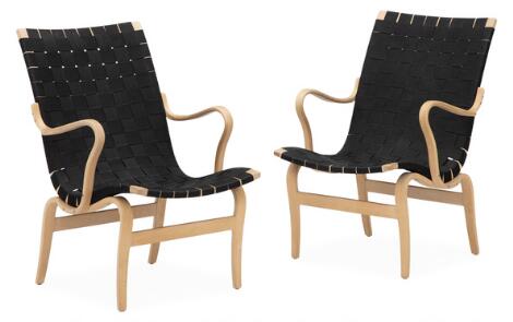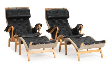 2551/680AarhusBruno Mathsson: "Pernilla". Et par armstole af bøgetræ med tilhørende skamler, betræk af sort skind. Udført hos Dux. (4)