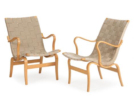 2551/797AarhusBruno Mathsson: “Eva”. Et par læneestole af formbøjet bøg, udspændt med flettede gjorde af kanvas. Dux. (2)