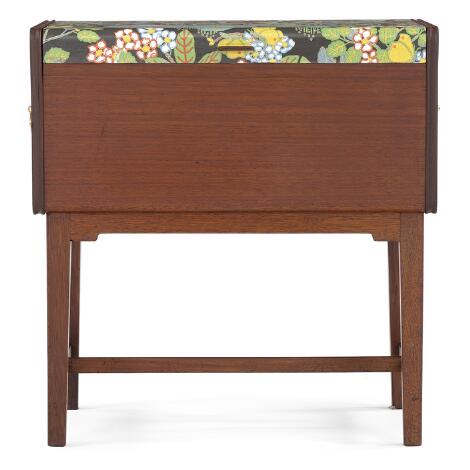 Ludvig Pontoppidan: Sybord af mahogni opsat og greb af messing. Opklappeligt låg hvorunder rum og to justerbare ruminddelte bakker.