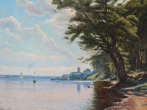 2549/171Emil Wennerwald: Coastal view of Middelfart seen from the forest at Kongebro. Signed. Oil on canvas. 77 x 101 cm.