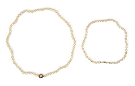 2550/1248LyngbyHugo Grün a.o.: Two pearl necklaces set with pearls and two clasps, one set with a pearls, mounted in 14k gold. L. 40 and 59 cm. (2).