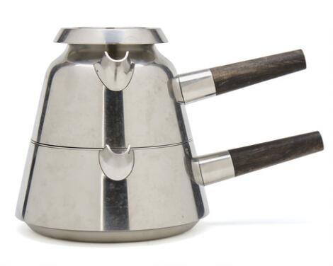 2549/567Magnus Læssøe Stephensen: Stainless steel combined two-piece tea- and waterpot with wooden handles. Made and stamped by Georg Jensen. (2)
