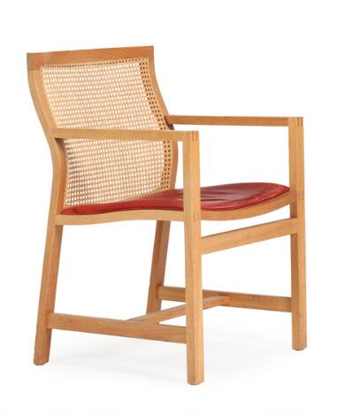 2551/1077AarhusRud Thygesen, Johnny Sørensen: "Kongeserien". Armchair with oak frame, upholstered with reddish leather. Back with woven cane. Manufactured by Botium.