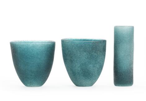 2551/1064AarhusTobias Møhl, Trine Drivsholm: Tre vaser af glas med sandblæste overflader. Signeret M&D. H. 10 og 13 cm. (3)