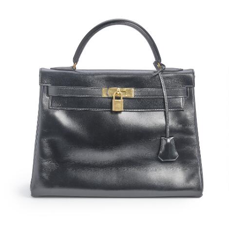 931/7LyngbyHermès: A "Kelly Retourne 32" bag of black box leather with gold tone hardware and short handle. 1989.