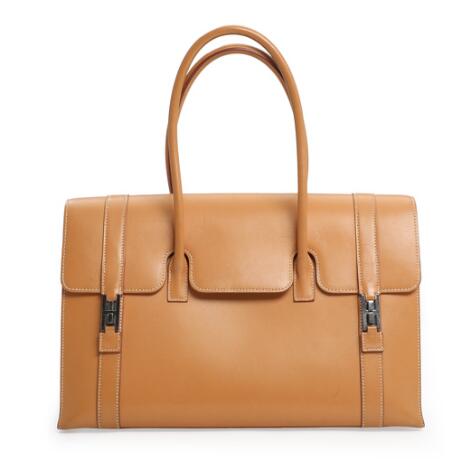 2550/9027Aarhus"Drag" of camel coloured box leather with two handles and silver tone hardware.