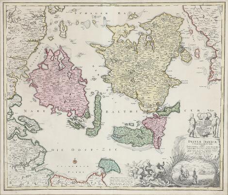 2549/8051Johann Baptist Homann: "Insvlæ Danicæ". 1716. Handcoloured engraving. Visible size 51 x 60 cm.