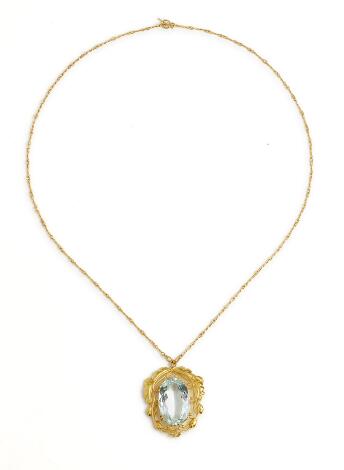 931/51LyngbyGeorg Jensen: Aquamarinhalskæde af 18,5 kt. guld prydet med oval facetslebet aquamarin. Dessin 130. L. 52 cm. Georg Jensen 1933-1944.