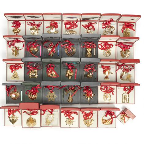 2549/976Georg Jensen: “Golden Christmas”. En samling juleuroer af forgyldt metal. I originale æsker. (35)