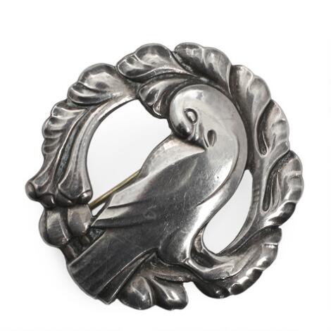 2550/1190AarhusGeorg Jensen, Kristian Møhl-Hansen: Broche af sterlingsølv. Udført hos Georg Jensen 1933-44. L. 4,6 cm.