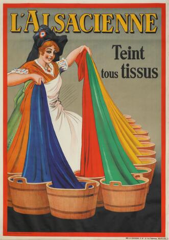 Albert Dorfinant: "L'alsacienne, Teint tours tissus". Signed in the print. Lithographic poster. 1920/30s. Sheet size 160 x 120 cm. Unframed.