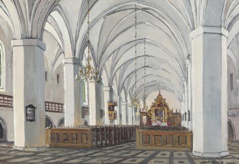 Christian Bogø: Kirkeinteriør. Sign. Chr. Bogø. Olie på lærred. 37 x 53.
