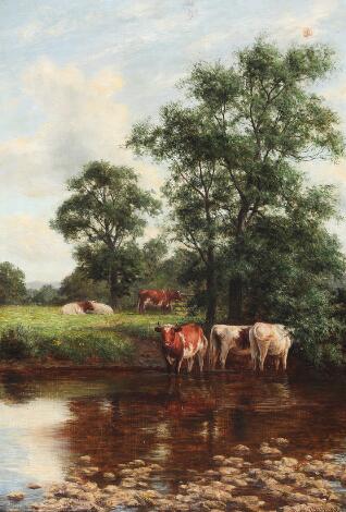 Dixon Clark: Parti med køer ved et vandingssted. Sign. Dixon Clark 93. Olie på lærred. 66 x 46.