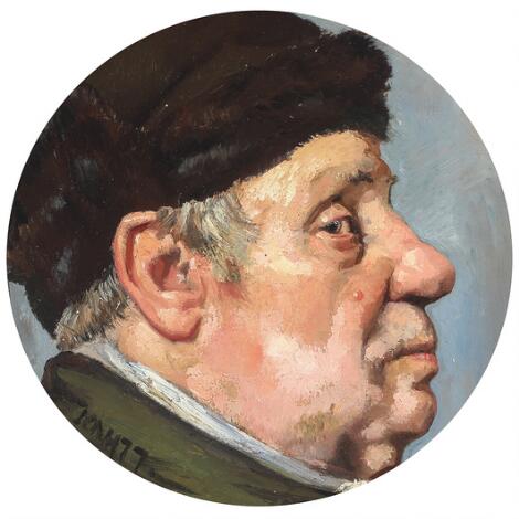 Hans Nikolaj Hansen: Profilportræt af herre med pelshue. Sign. HNH 77. Olie på lærred. 29,5 x 26.