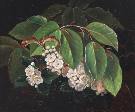 I. L. Jensen, skole, 19. årh.: Opstilling med bøgeblade og hvidtjørneblomster. Usigneret. Olie på lærred. 18,5 x 22.