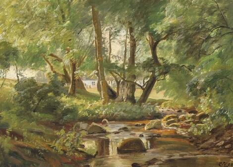 Christian Zacho: Parti fra et åløb med sollys gennem træerne. Signeret. Olie på lærred monteret på træ. 26 x 35.