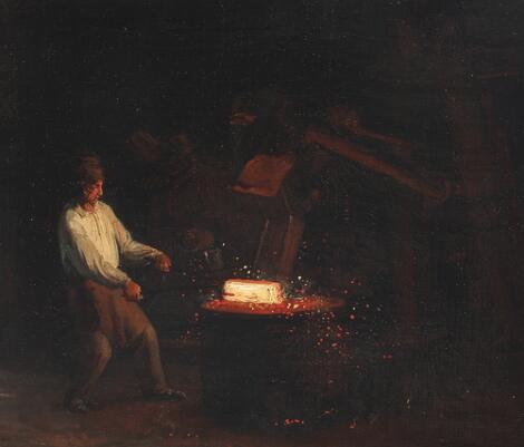 Adam Müller: En arbejdende smed i sit værksted. Usigneret. Olie på lærred. 18,5 x 21,5.