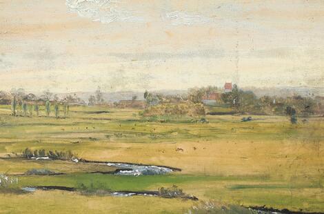 Dansk maler, 19. årh.: Landskab med udsigt til Nørrebroby kirke på Fyn. Usigneret. Olie på malepap. 16 x 24.