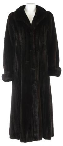 A long fur jacket of dark brown mink with clasps on the front, two pockets and dark brown lining.