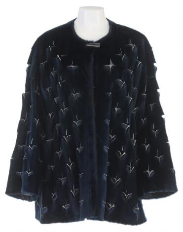 A fur jacket of dyed dark blue seal fur with decorative hole motif and button closure. L. 80 cm.