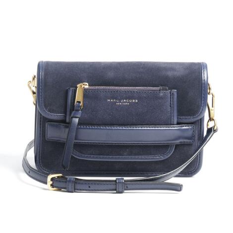 Marc Jacobs: A bag of dark blue suede and leather with gold tone hardware and detachable and adjustable shoulder strap.