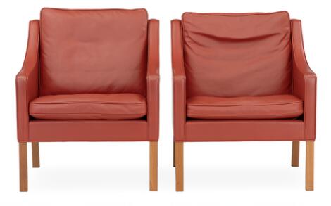Børge Mogensen: A pair of easy chairs with cherry wood legs. Upholstered with red leather. (2)