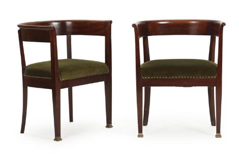 Danish cabinetmaker: A pair of patinated oak art nouveau armchairs, upholstered with green velour, front legs with brass shoes. 1910-20s. (2)
