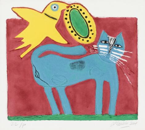 Corneille: "Chat bleu", 2001. Signed Corneille, 22/70. Relief print in colours. Visible size 40 x 43 cm.
