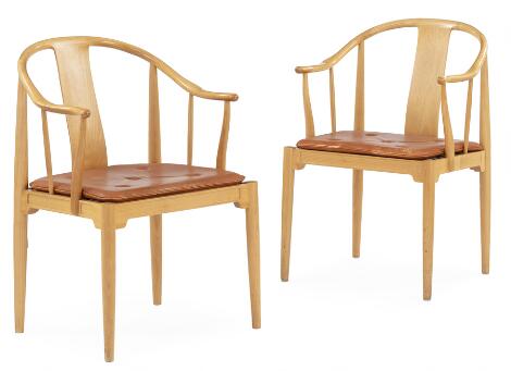 Hans J. Wegner: "Kinastolen". A pair of cherrywood armchairs. Seat cushions upholstered with brown leather. (2)