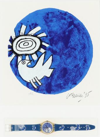 Corneille: "Vive la paix", 1995. Signed Corneille, HC. Colour screenprint and Swatch wristwatch. 49 x 39 cm.