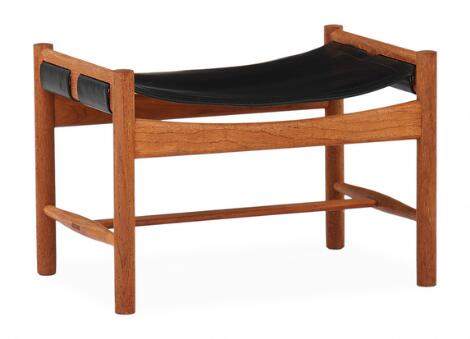 Kai Lyngfeldt Larsen: Solid teak stool. Seat upholstered with black leather. Manufactured by Søborg Møbler.
