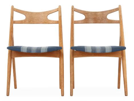 Hans J. Wegner: “Saw horse chair”. A pair of oak dining chairs. Seat upholstered with blue striped wool. (2)