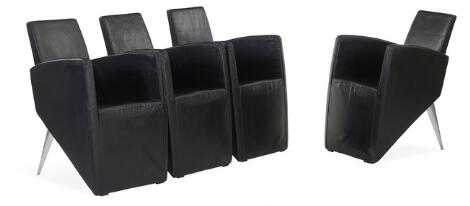 Philippe Starck: Set of four easy chairs upholstered with black leather. Steel back leg. Marked Starck. (4)