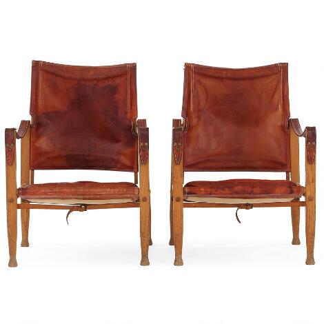 Kaare Klint: "Safari Chair". A pair of ash wood armchairs. Upholstered with patinated leather and full grain leather. (2)