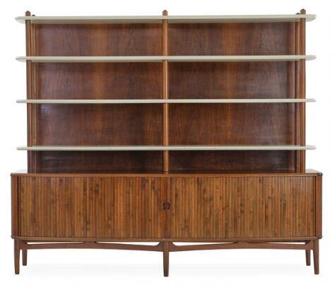 Kurt Olsen: A walnut wall unit consisting of sideboard and top with four shelves. H. 180. W. 210. D. 46 cm.