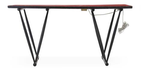 Frode Holm: Work table with sculptural V-shaped, black lacquered frame, top with red linolium.