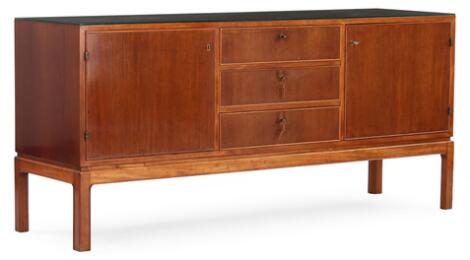 Fritz Hansen: Mahogany sideboard. Top with glass plate. Front with three drawers and two doors.