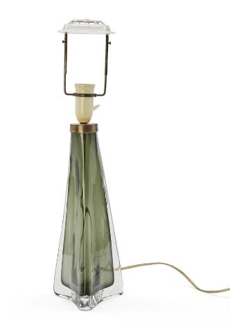 Orrefors: Three-sided table lamp of clear glass underlaid with green glass. Signed Orrefors. H. 35.5/56 cm.