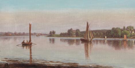 2545/256Christian Berthelsen: Udsigt over vandet med sejlskibe en rolig dag. Sign. monogram. Olie på lærred. 30 x 59.