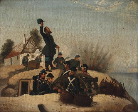 2545/262Dansk maler, 19. årh.s midte: Scene fra 2. Slesvigske Krig med soldater i kamp. Sign. I. P. Ebbesen 1868. Olie på lærred. 29 x 35,5 cm.