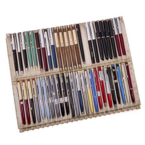 2545/1237Hoover m. fl.: En samling fyldepenne, kuglepenne og stiftblyanter af resin, metal m.m. på præsentationsbakke. (47)