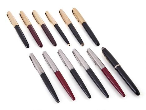 2545/1240Parker m. fl.: 11 fyldepenne og en kuglepen af sort og mørkerød resin, flere med hætter af forgyldt metal. (12)