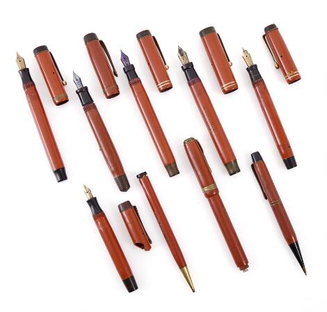 2545/1243Parker, Montblanc: "Duofold" m.m. En samling af syv fyldepenne og to stiftblyanter af koralrød resin. (9)