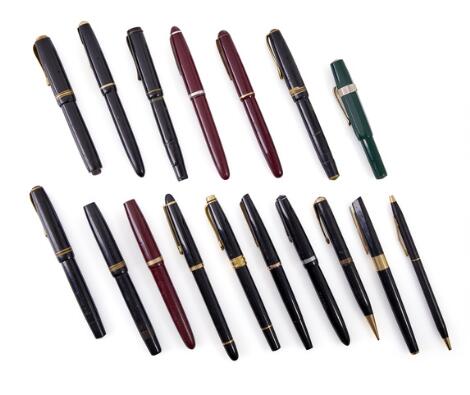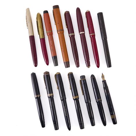 2545/1241Parker m. fl.: "Duofold", "The Burnham" m. fl. En samling af 15 fyldepenne, hvoraf 13 har pennespidser af 14 kt. guld. (15)