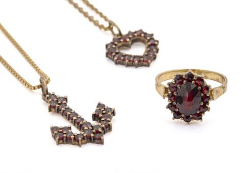 2545/1220Granatsmykkesamling af forgyldt sølv bestående af ring og to vedhæng med halskæder. Str. 50. (5)