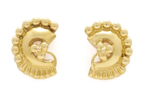 2545/1219Et par øreklips af 15 og 21 kt. guld. Samlet vægt ca. 7 g. L. 21,8 mm. (2)