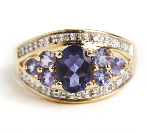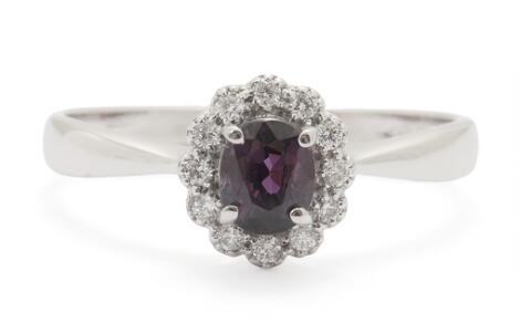 2545/1217Diamantring af 10 kt. guld prydet med talrige enkeltslebne diamanter og facetslebne lilla sten. B. 12,5 mm. Str. 58.