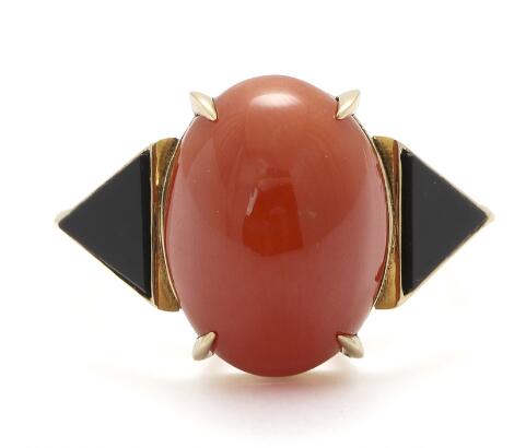 2545/1201Koral- og onyksring af 18 kt. guld prydet med cabochonslebet koral og poleret onyks. B. 14,5 mm. Str. 52,5.