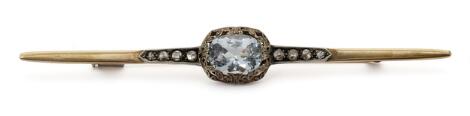 2545/1199Diamantbroche af 17 kt. guld og hvidguld prydet med en blå syntetisk spinel og rosenslebne diamanter. L. 9,3 cm.