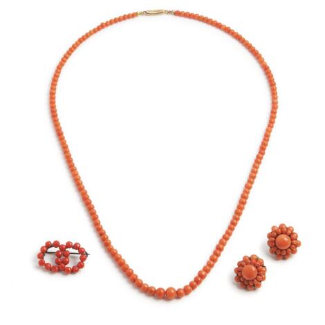2545/1182Koral smykkesamling af sterling sølv bestående af et par ørestikker, broche og halskæde. L. 61 cm. (4)